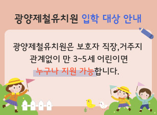광양제철유치원은 보호자 직장, 거주지 관계없이 만 3~5세 어린이면 누구나 지원 가능합니다.