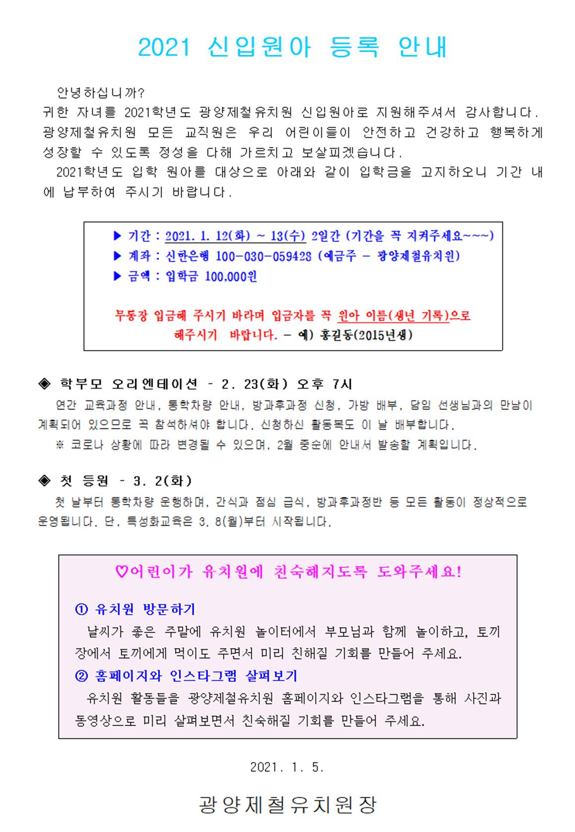 2021 신입원아 등록 안내