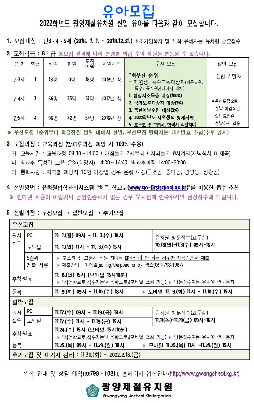 2022학년도 광양제철유치원 신입 유아를 다음과 같이 모집합니다.