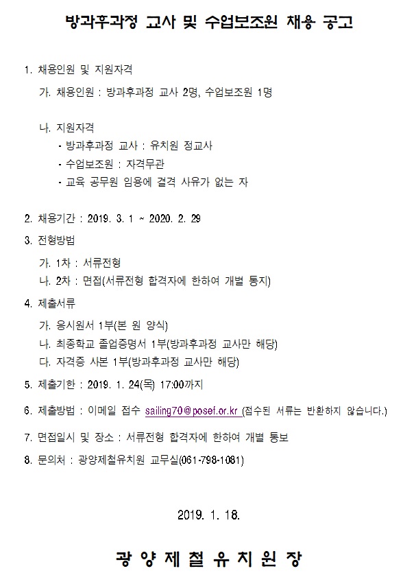 2019학년도에 함께 일하게 될 방과후과정교사 및 수업보조원 채용공고입니다.