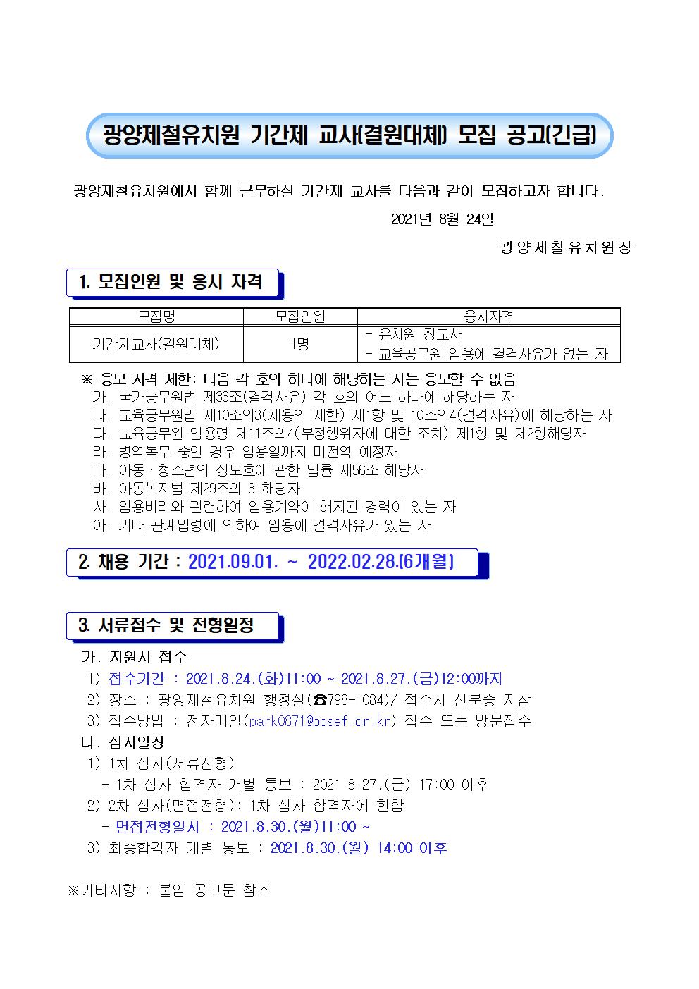광양제철유치원 기간제 교사(결원대체) 모집 공고(긴급)