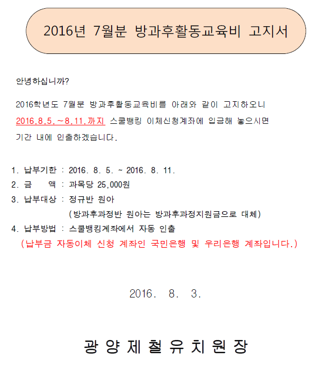 2016년 7월분 방과후활동교육비 고지서