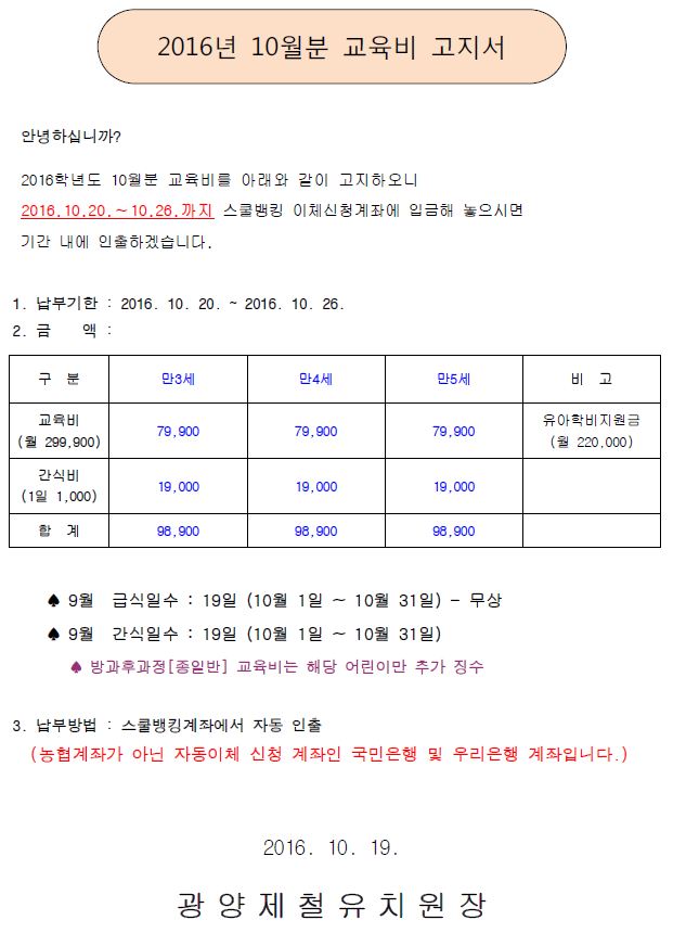 2016년 10월 14일 현장체험학습비 정산내역 공개
