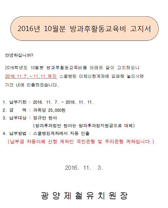 2016년 10월 14일 현장체험학습비 정산내역 공개