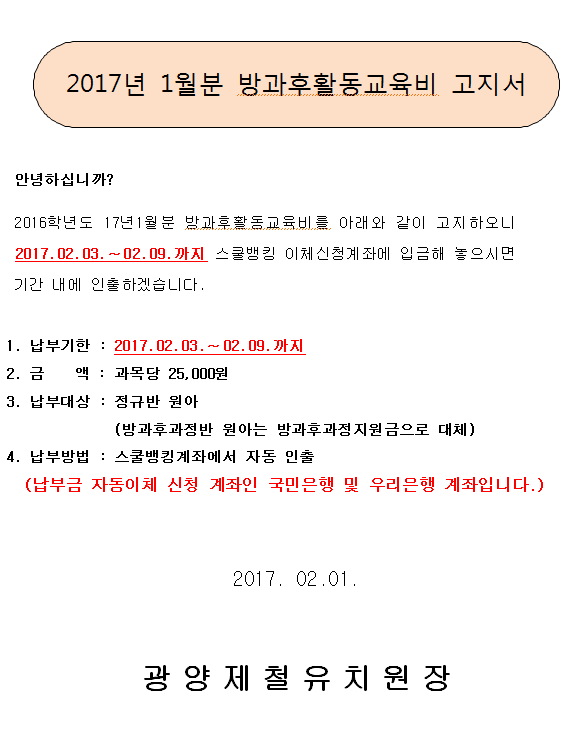 2017년 1월분 방과후 활동(특기적성)교육비 고지서