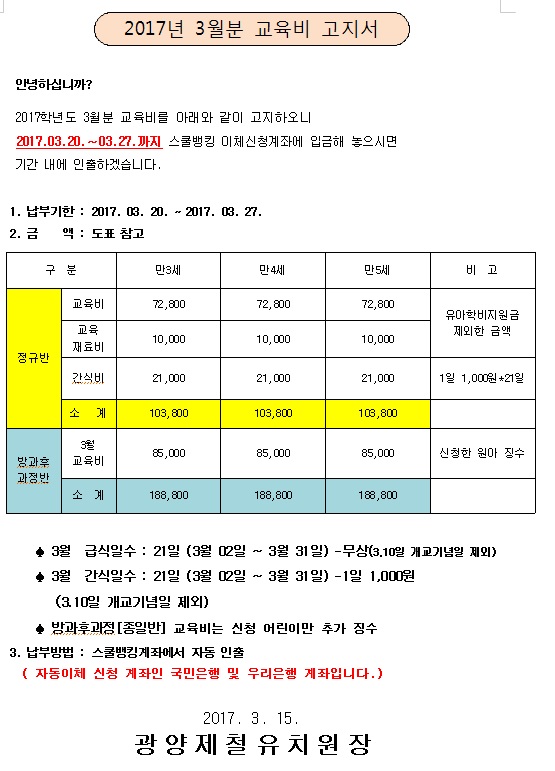 2017년 03월 교육비( 교육비,교육재료비,간식비, 방과후과정반) 고지서 안내