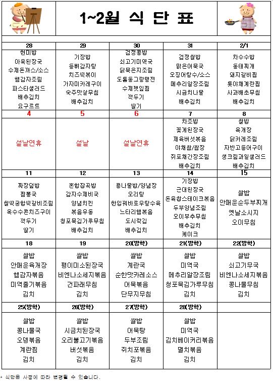 2019년 1월~2월 급식식단표