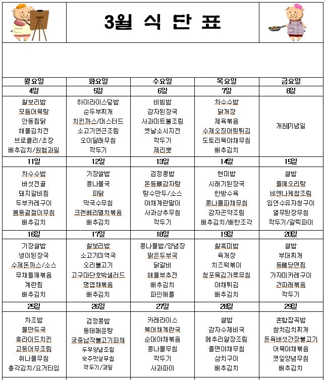 2019.03월 급식 계획표