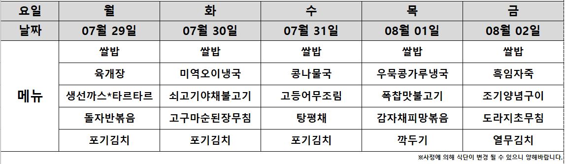 7월 29일~ 8월 2일 주간식단표입니다^^