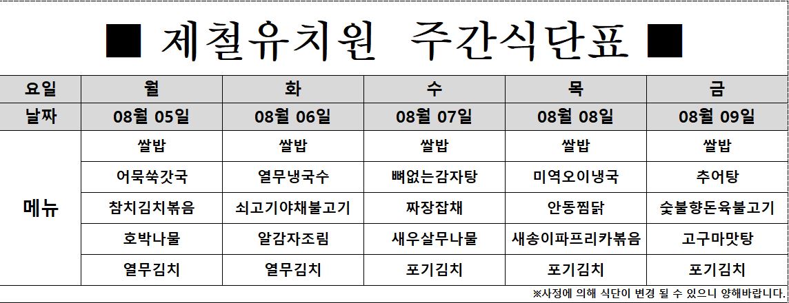 8월 5일~ 8월 16일 급식식단표 입니다~*