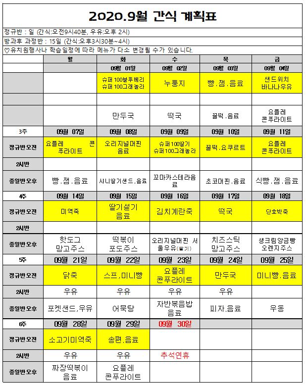 2020.9월 급.간식 계획표