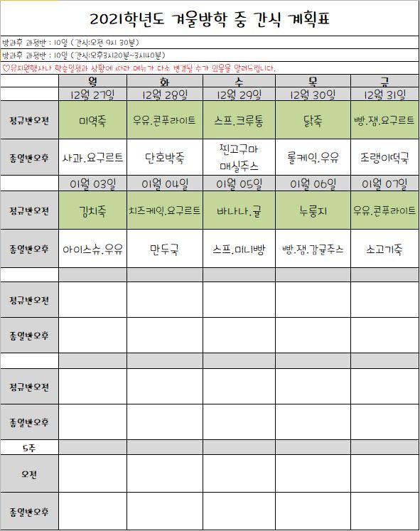 2021학년도 겨울방학 및 1월 급.간식 계획표