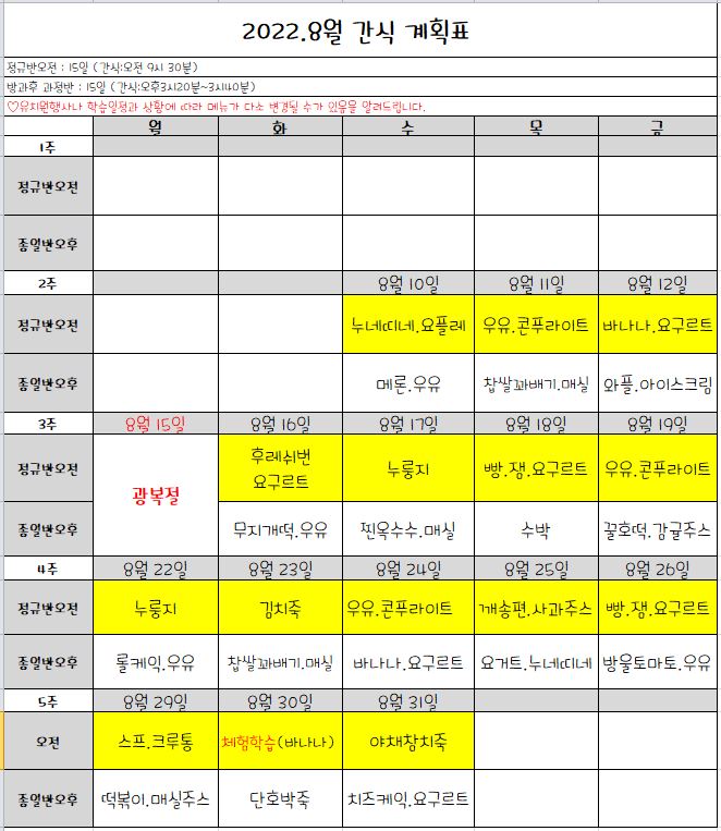 2022년 7-8월 방학중 간식, 급식 계획입니다.