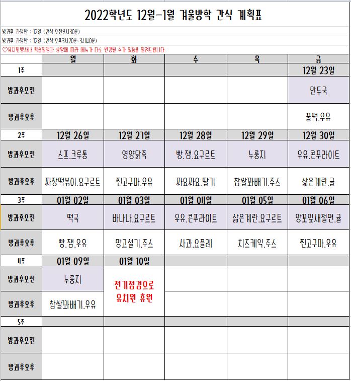 2022학년도12월-1월 방학중 간식, 급식 계획입니다.