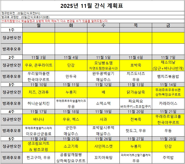2025년 11월 급.간식 계획표입니다.