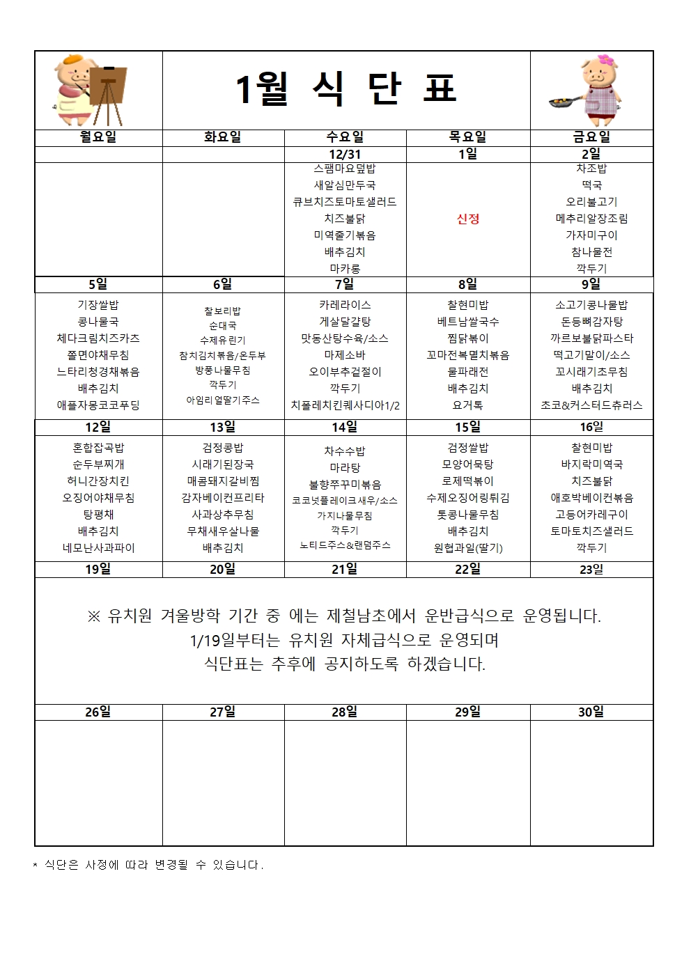 겨울방학기간(12/31~1/16) 급간식계획표입니다.