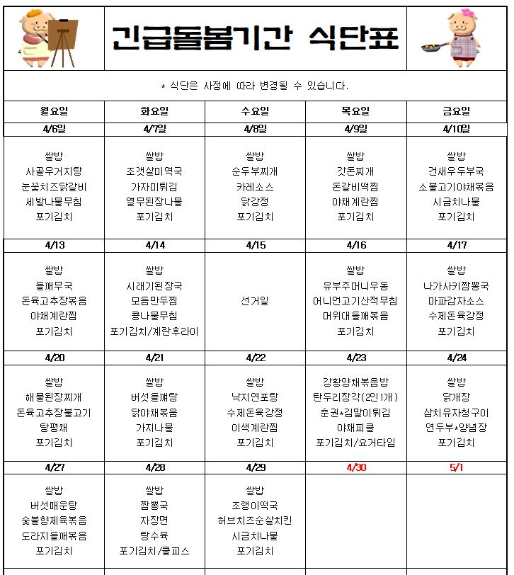 긴급돌봄 5월 급.간식 계획표