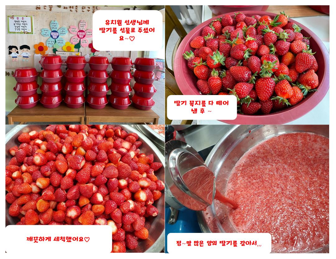 아이들 간식으로 나가는 딸기잼을 조리사선생님과 선생님들의 도움으로 직접 만들어 보았습니다.