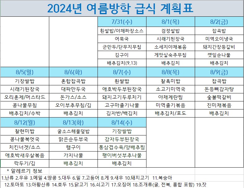 2024년 여름방학 급.간식 계획표입니다.(7월31일~8월14일)