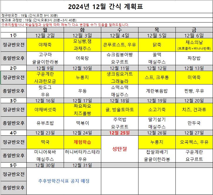 겨울방학 간식계획표 및 식단표는 추후 공지하도록하겠습니다.