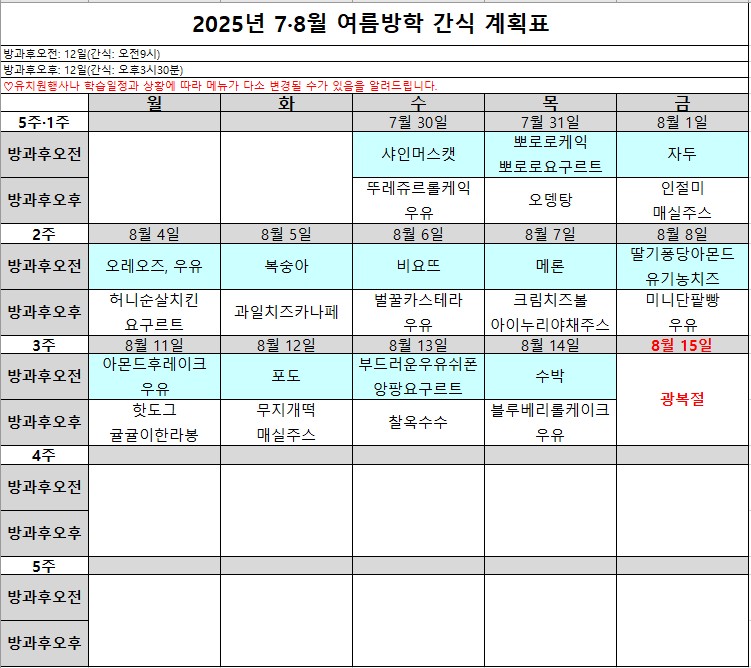 2025년 7,8월 여름방학 급간식계획표입니다.