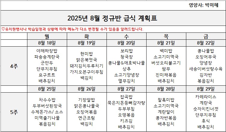 2025년 7,8월 여름방학 급간식계획표입니다.